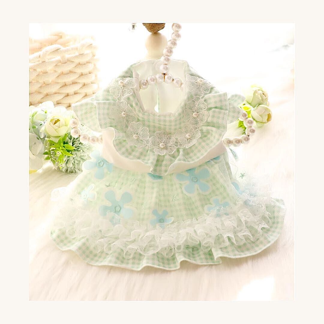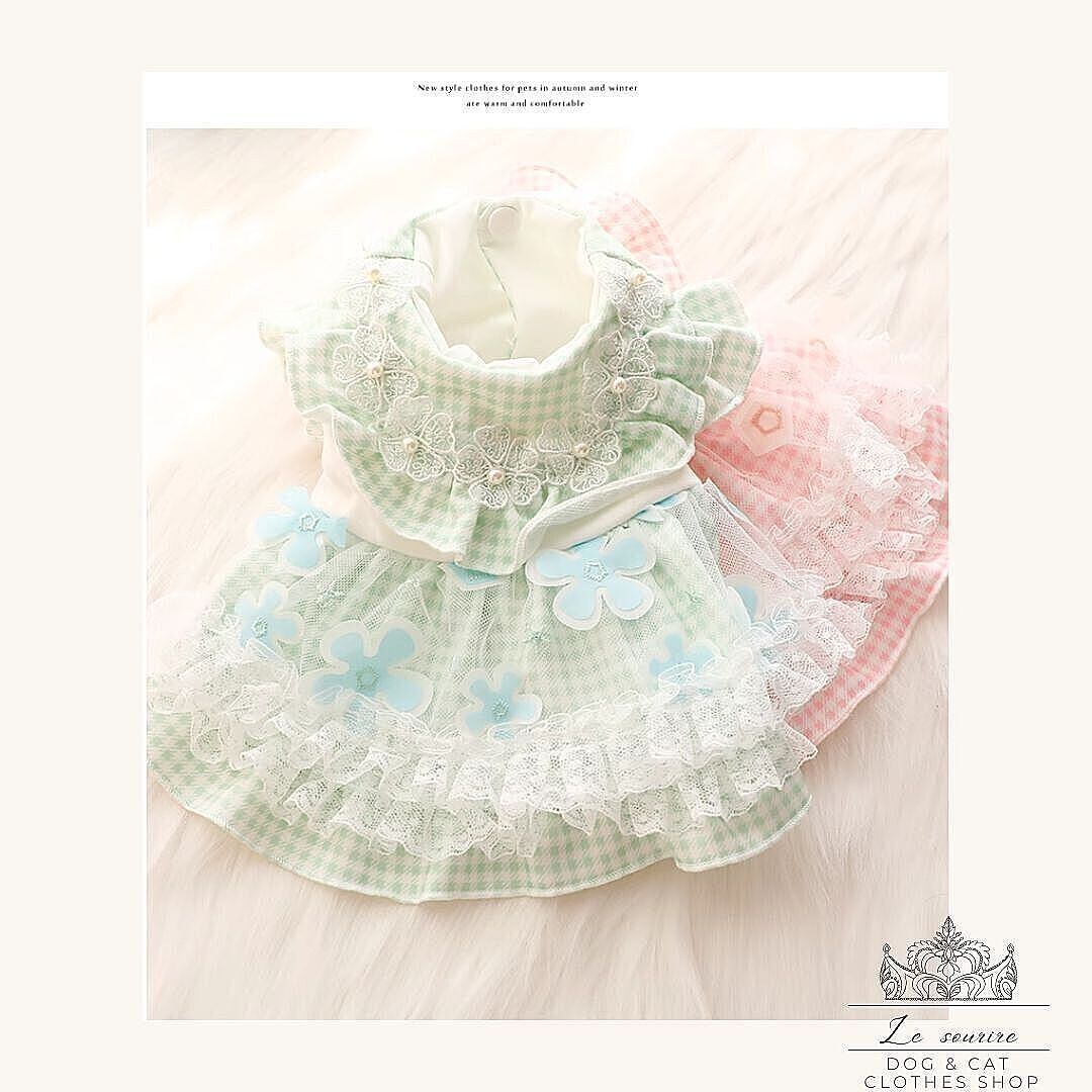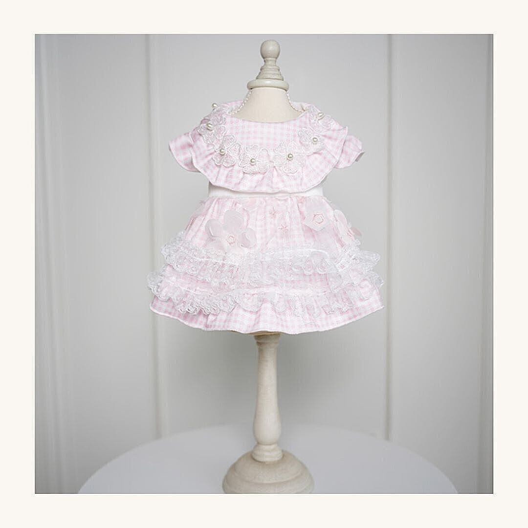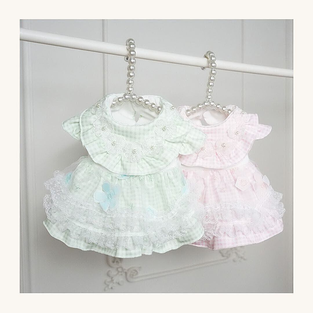 予約【№B04597】フラワーモチーフ ギンガムチェック柄 フリルワンピ リード取り付け金具付き(2カラー)