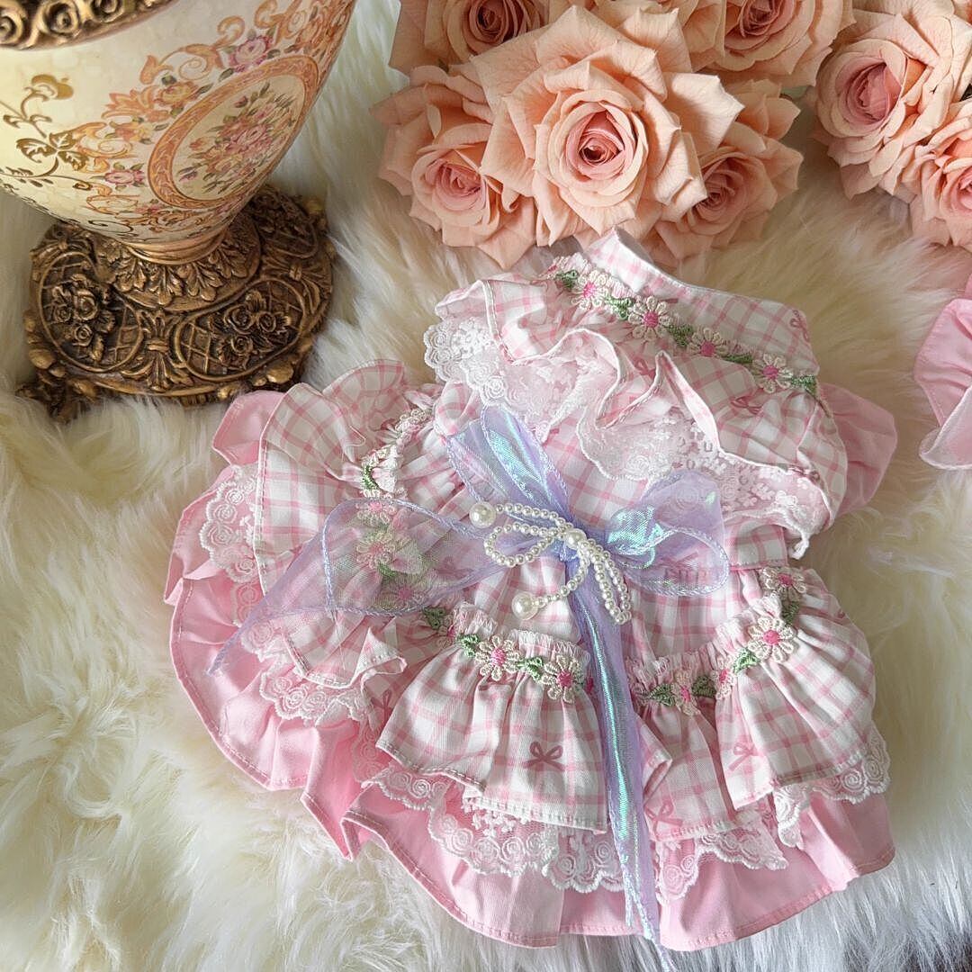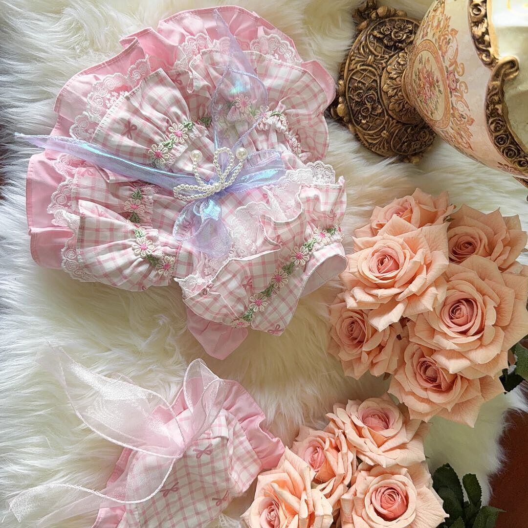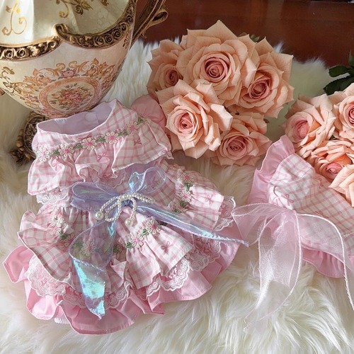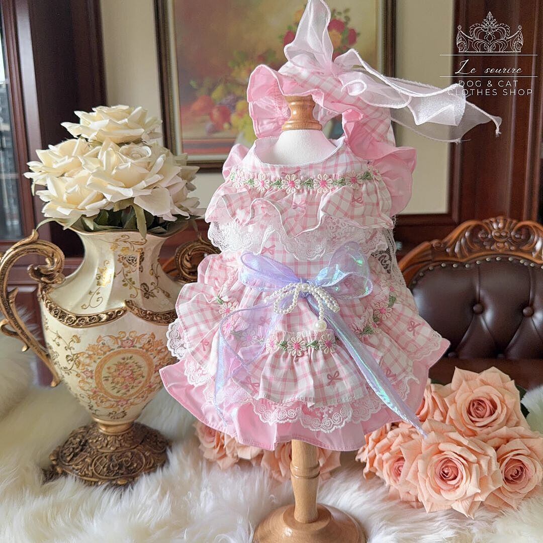 予約【№B05267】ピンクチェック柄 フラワー刺繍 フリルワンピ(帽子:オプション)