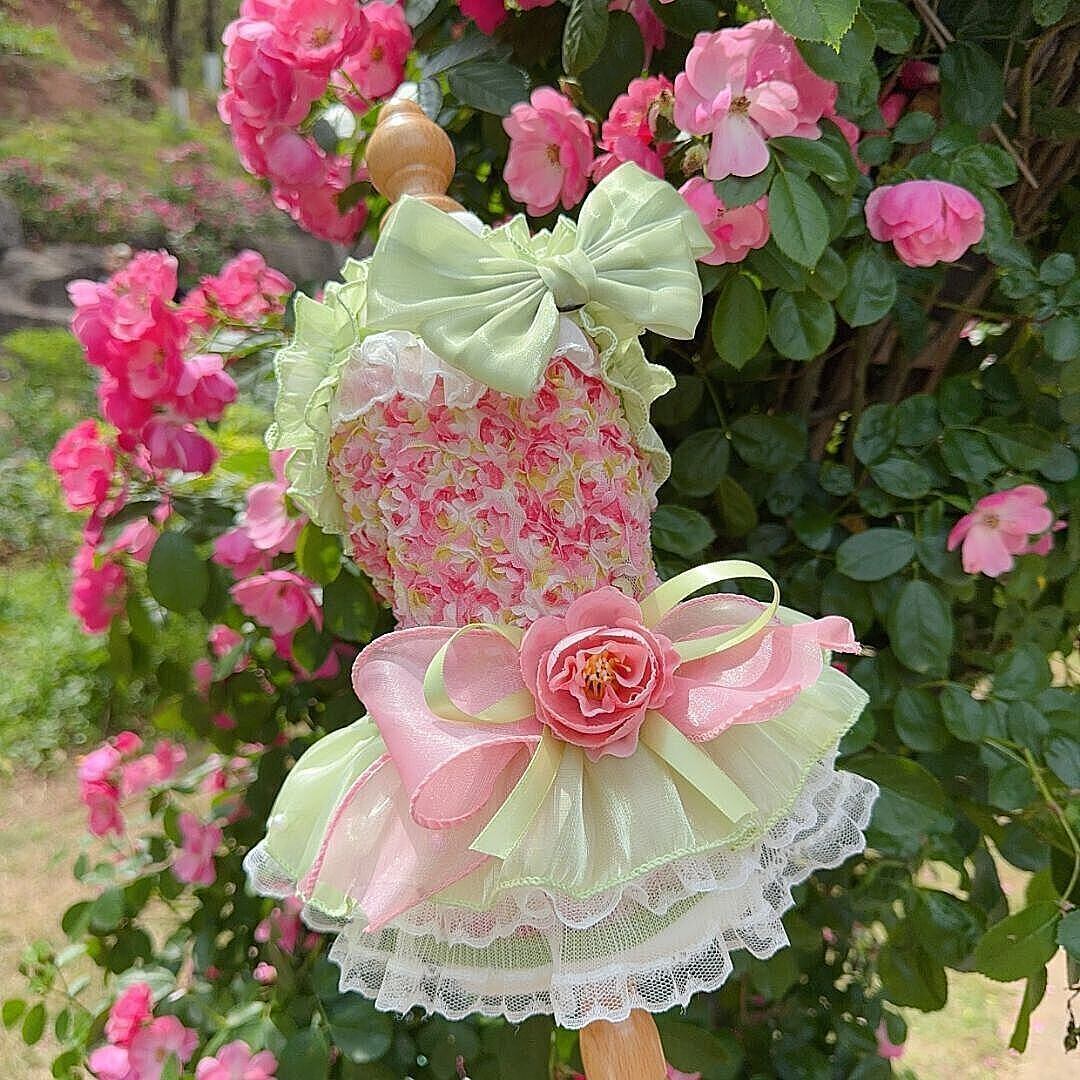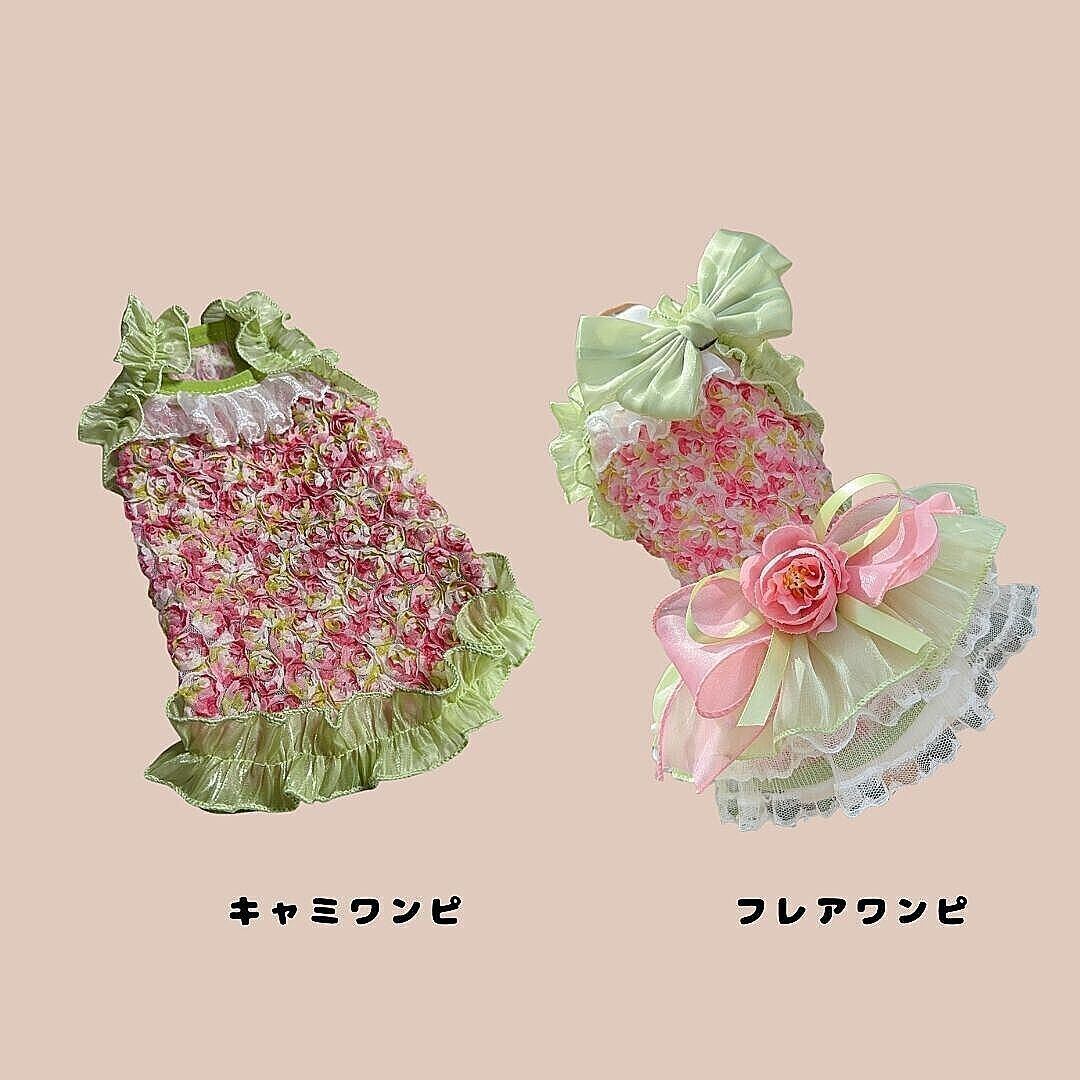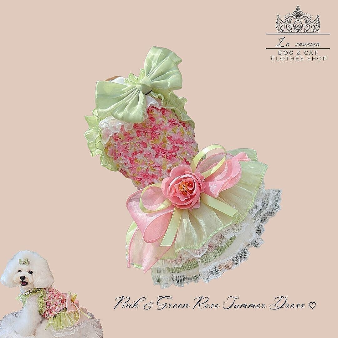 予約(海外ハンドメイド)【№B05976】ピンク&グリーン ローズ ドレスワンピ