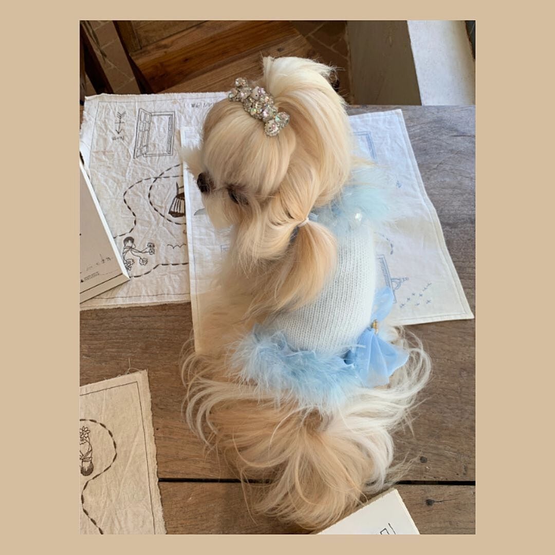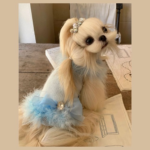 予約【№B06546】ベビーブルー ふわふわフェイクファー ビジューリボン プリンセス ニットワンピ