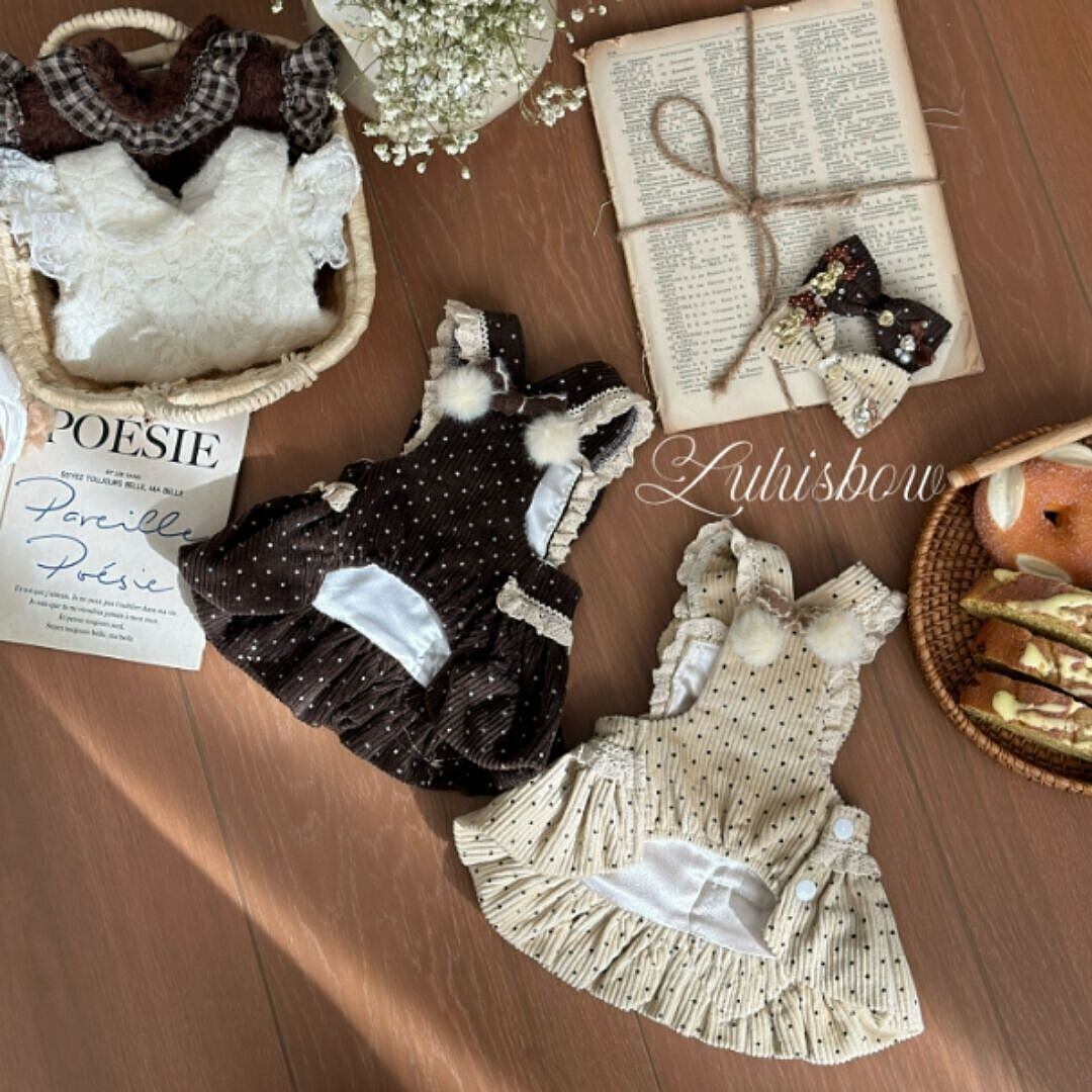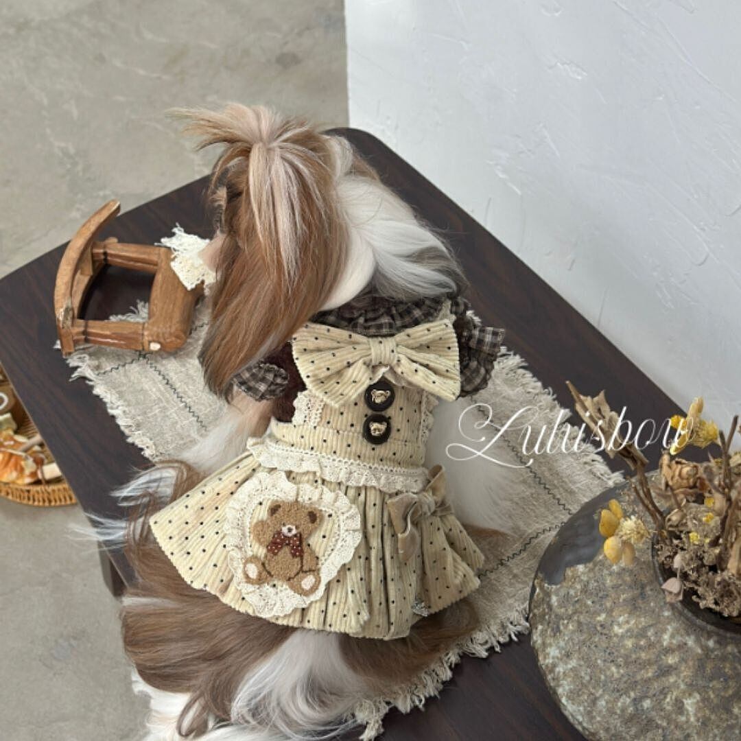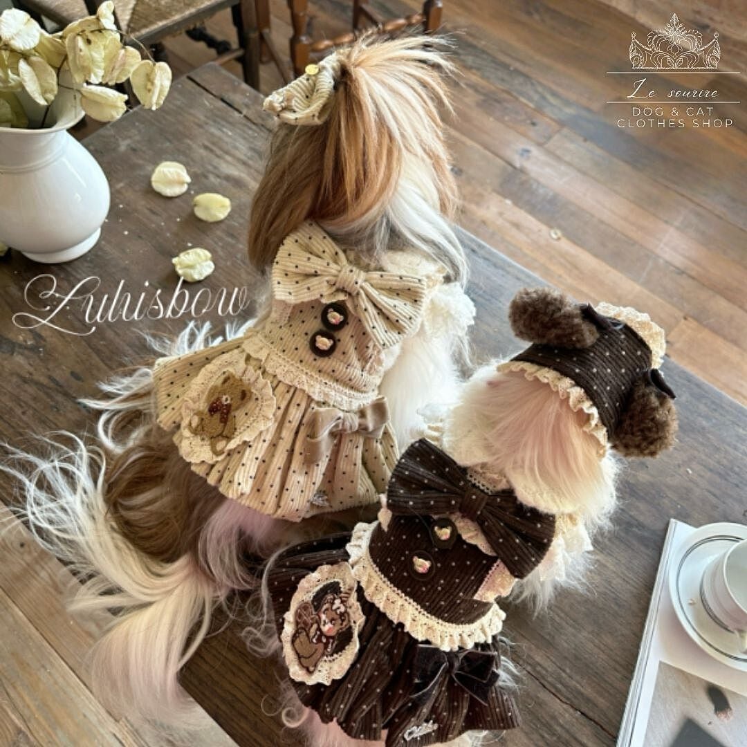 予約(海外ハンドメイド 受注製作品)【№B07094】Lulu’sBow くま刺繍 コーデュロイ ドット フレアワンピ(バレッタなし)
