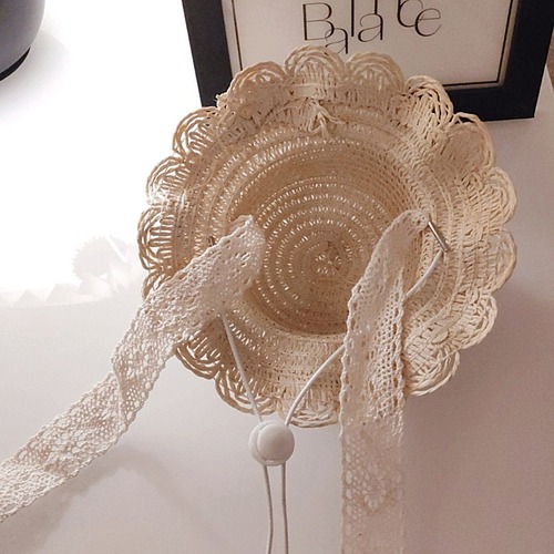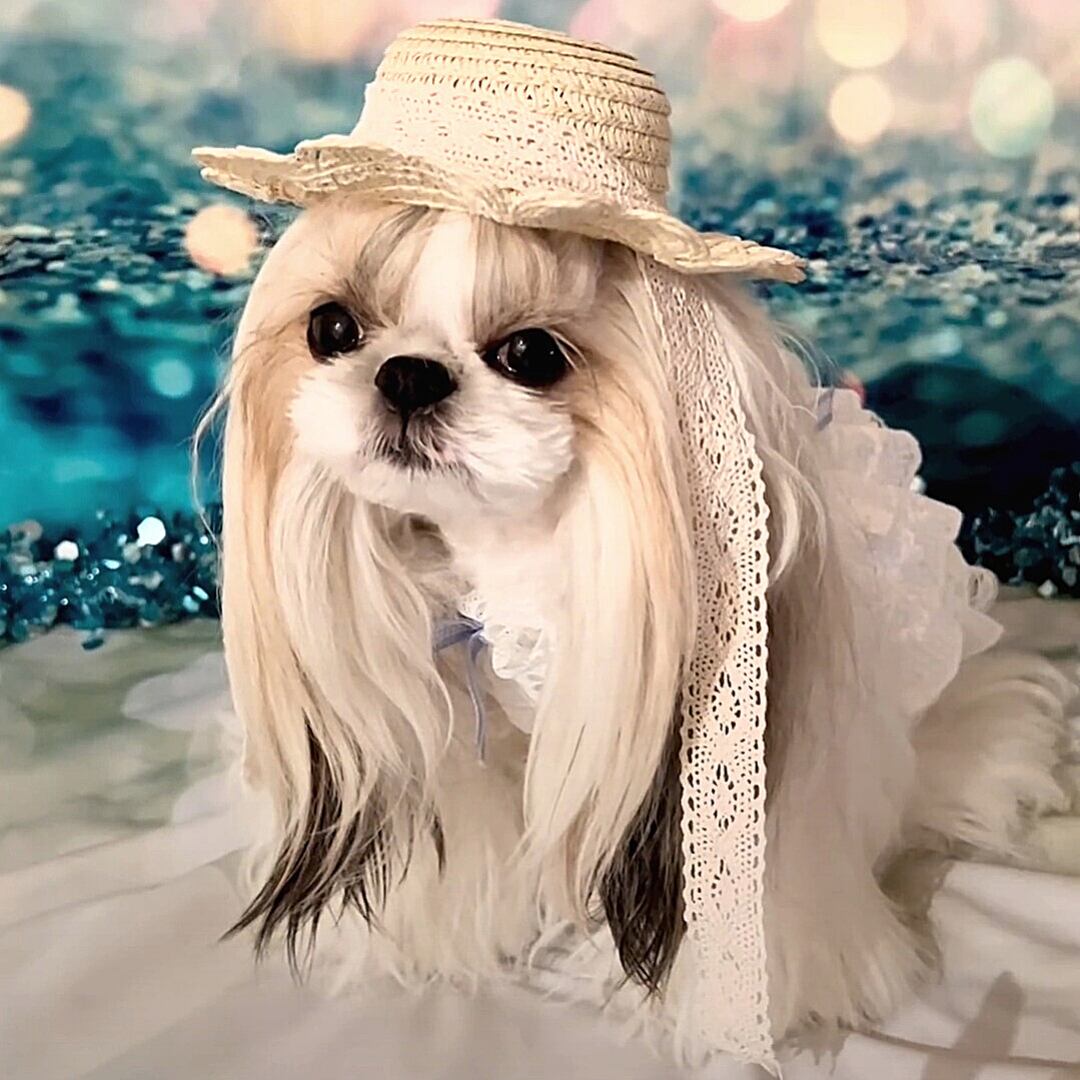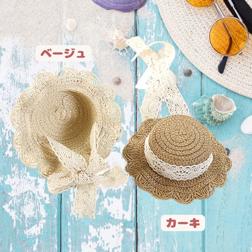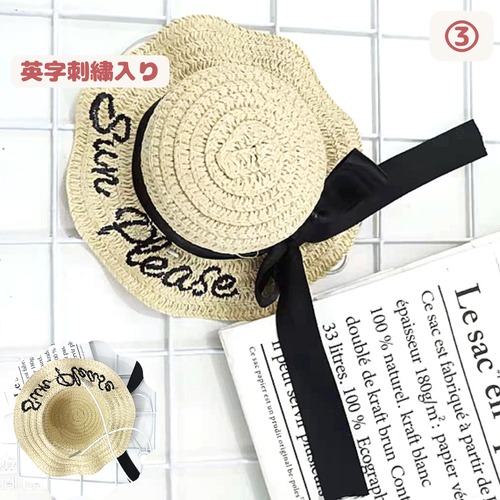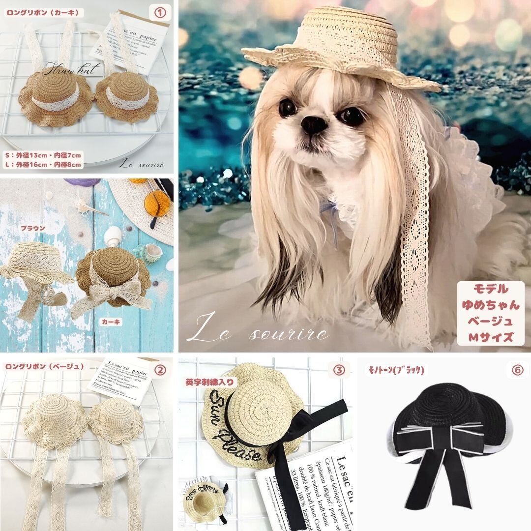 在庫限り【№E00108-A】犬用 猫用 麦わら帽子 ロングリボン・英字刺繍・パールモチーフ・モノトーン